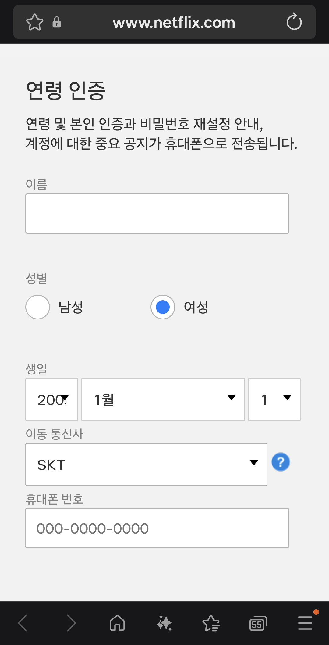 나의 통신사 정보와 넷플릭스 연령 인증 정보가 이름, 성별, 생년월일, 전화번호, 이동통신사까지 모두 동일한지 꼼꼼히 확인해 보세요.